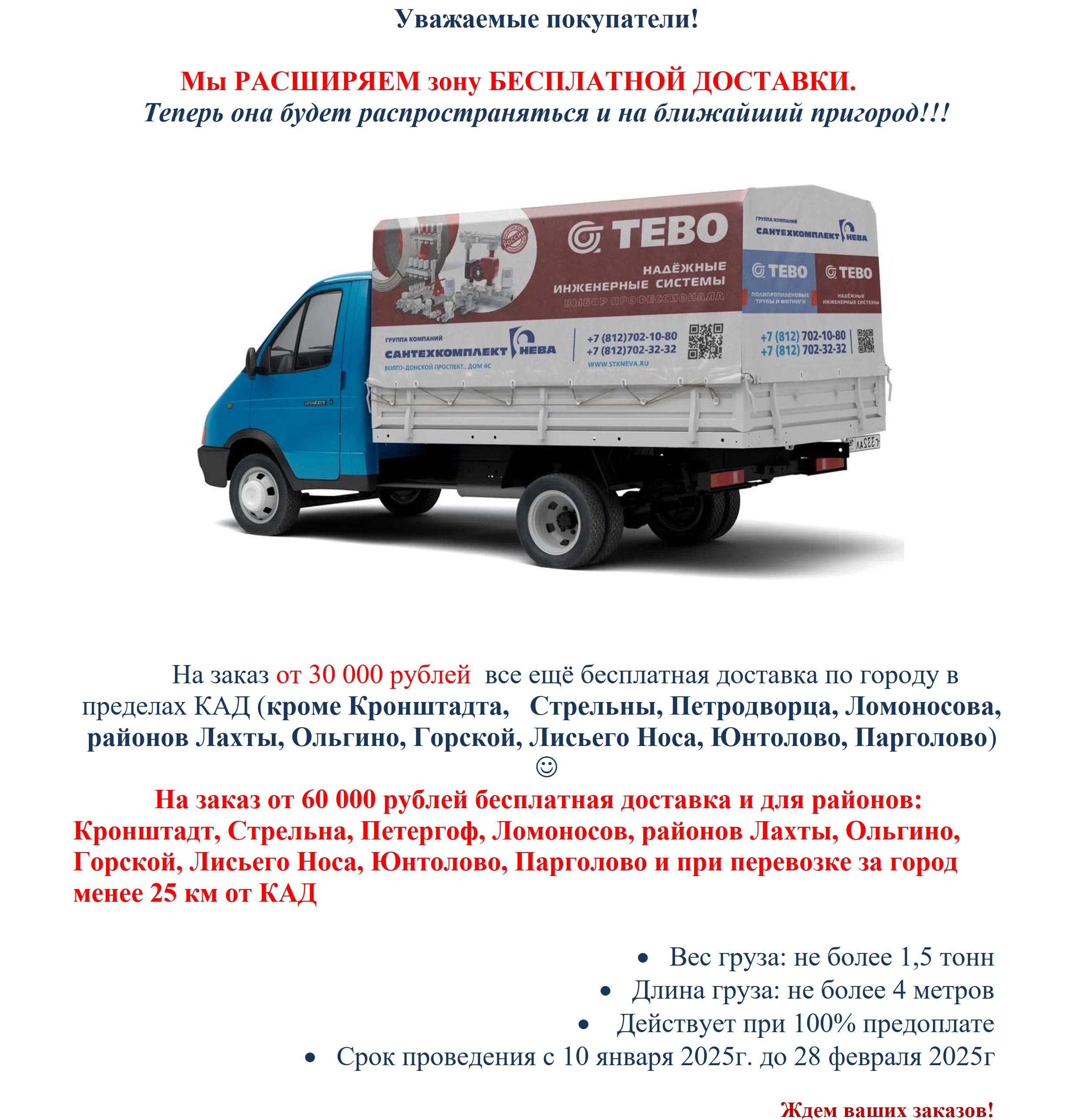 НовостиГрафик работы!28.04.2025Обращаем ваше внимание на ГРАФИК РАБОТЫ в праздничные дни: 30 апреля 2025 - сокращенный рабочий день до 16:30. С 1 мая 2025 по 4 мая 2025 - выходные дни. С 5 мая 2025 по 7 мая 2025 - рабочие дни. С 8 мая 2025 по 11 мая 2025 - выходные дни. Повышение цен!!04.07.2024Сообщаем Вам, что в связи с ростом цен на сырье, производитель вынужден изменить отпускные цены на часть продукции тм ТЕВО с 15.07.2024 года. В среднем увеличение составит до 10%.